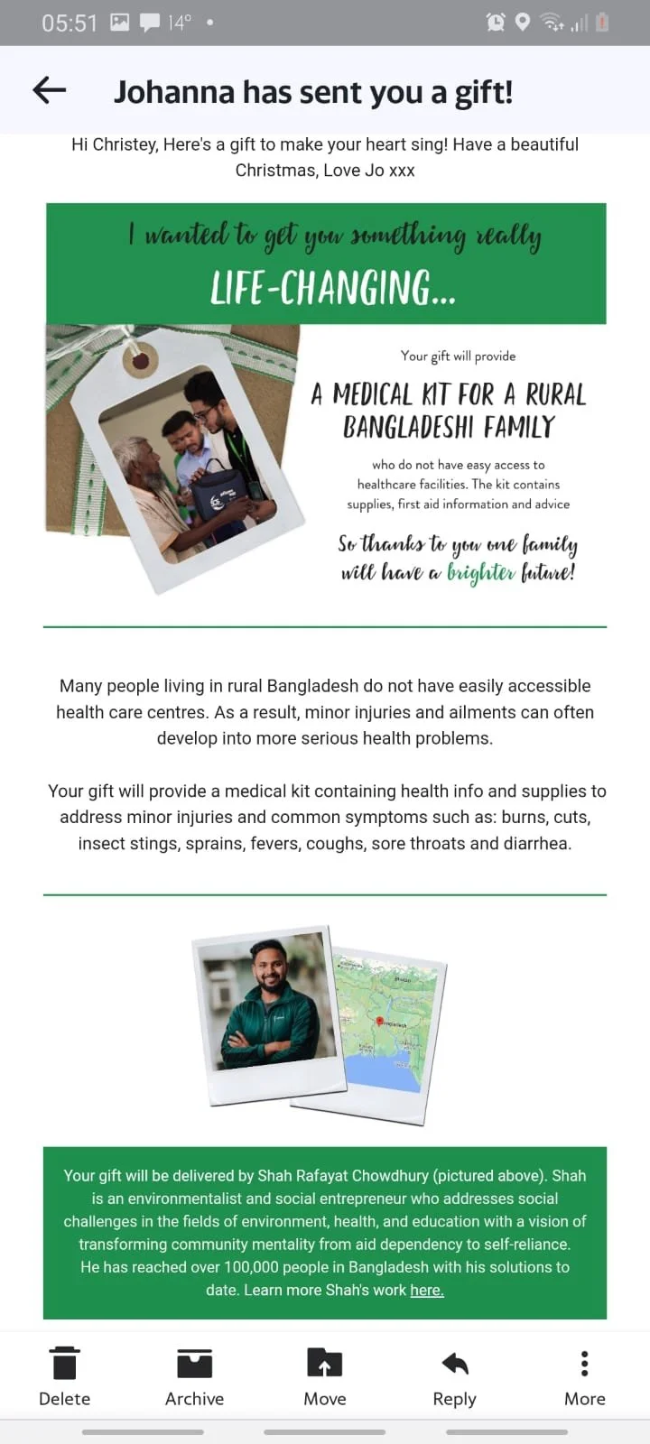 When you give the Gift of Medical Support, Shah will deliver a medical kit to an isolated Bangladeshi community to serve two families. This medical kit will contain essential commodities to address and treat minor traumatic injuries and basic common symptoms including: burns, cuts, abrasions, insect stings, sprains, strains, fever, cough, sore throat, diarrhea, vomitting, dehydration.