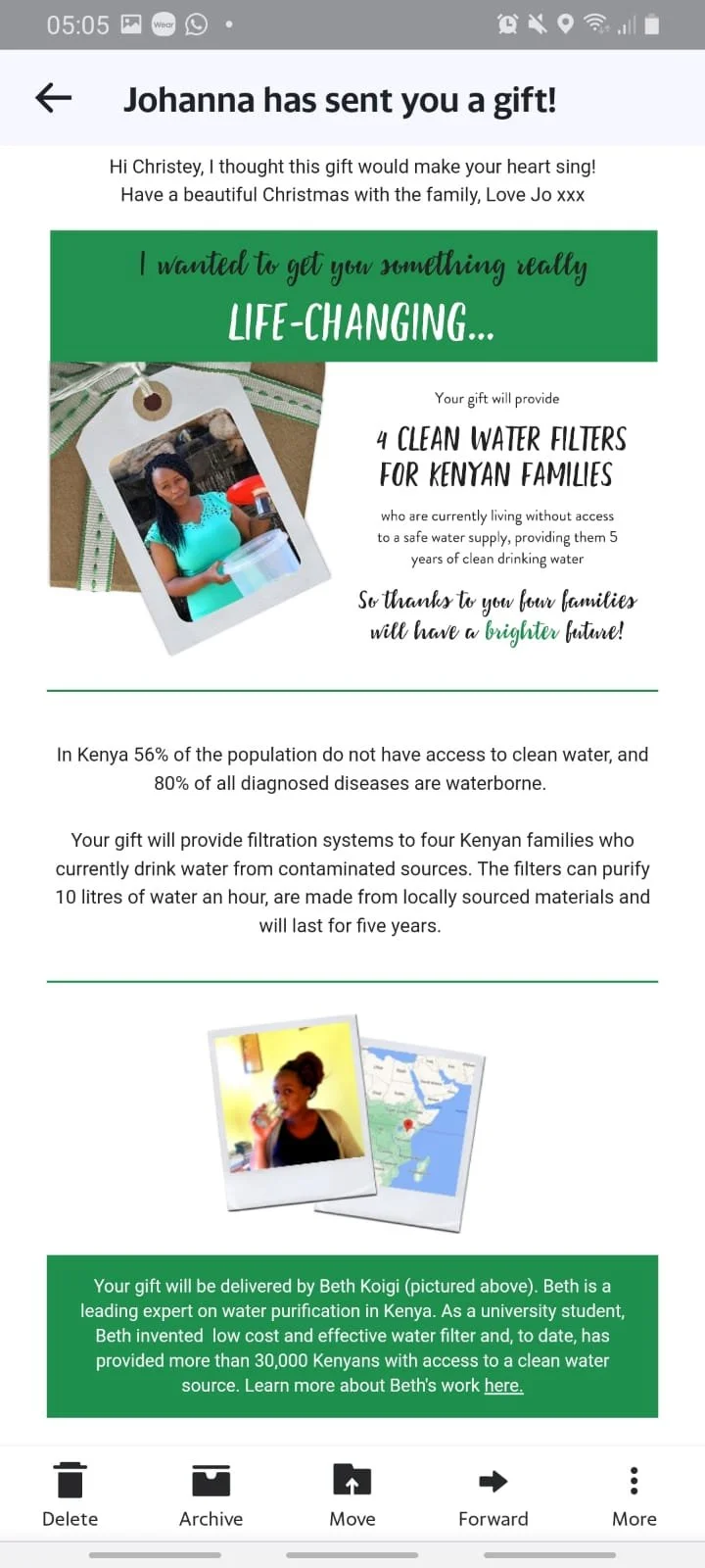 When you give the Gift of Clean Water, Kenyan entrepreneur Beth Koigi will build and deliver a filter to a Kenyan family who currently drinks water from contaminated sources. Beth’s water filters can purify 10 litres of water an hour, are made from locally sourced materials and will last for five years. The filters are so efficient that there’s plenty of clean water for cooking, bathing and laundry, significantly raising the overall health and living standards of each family that receives them.